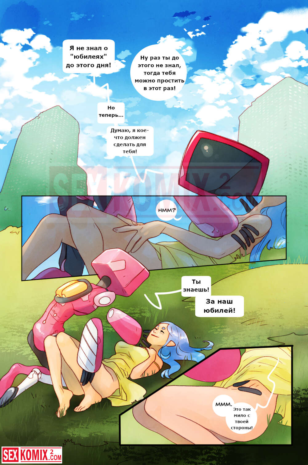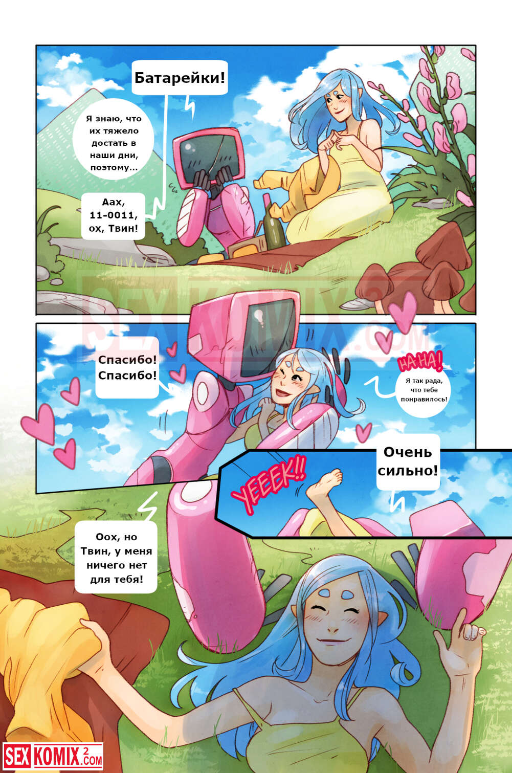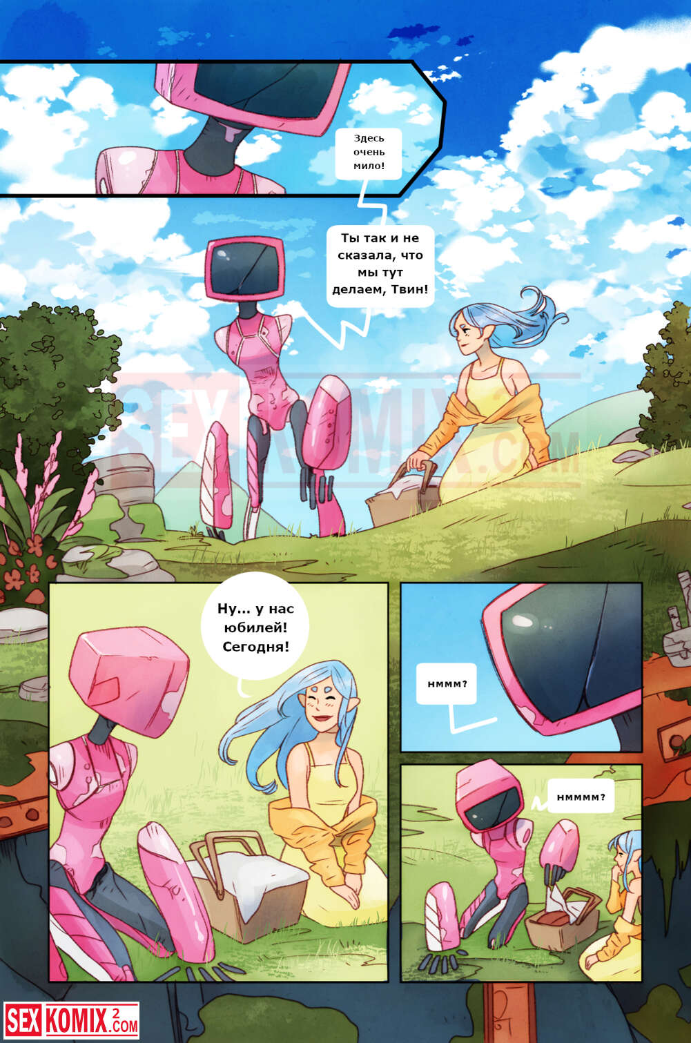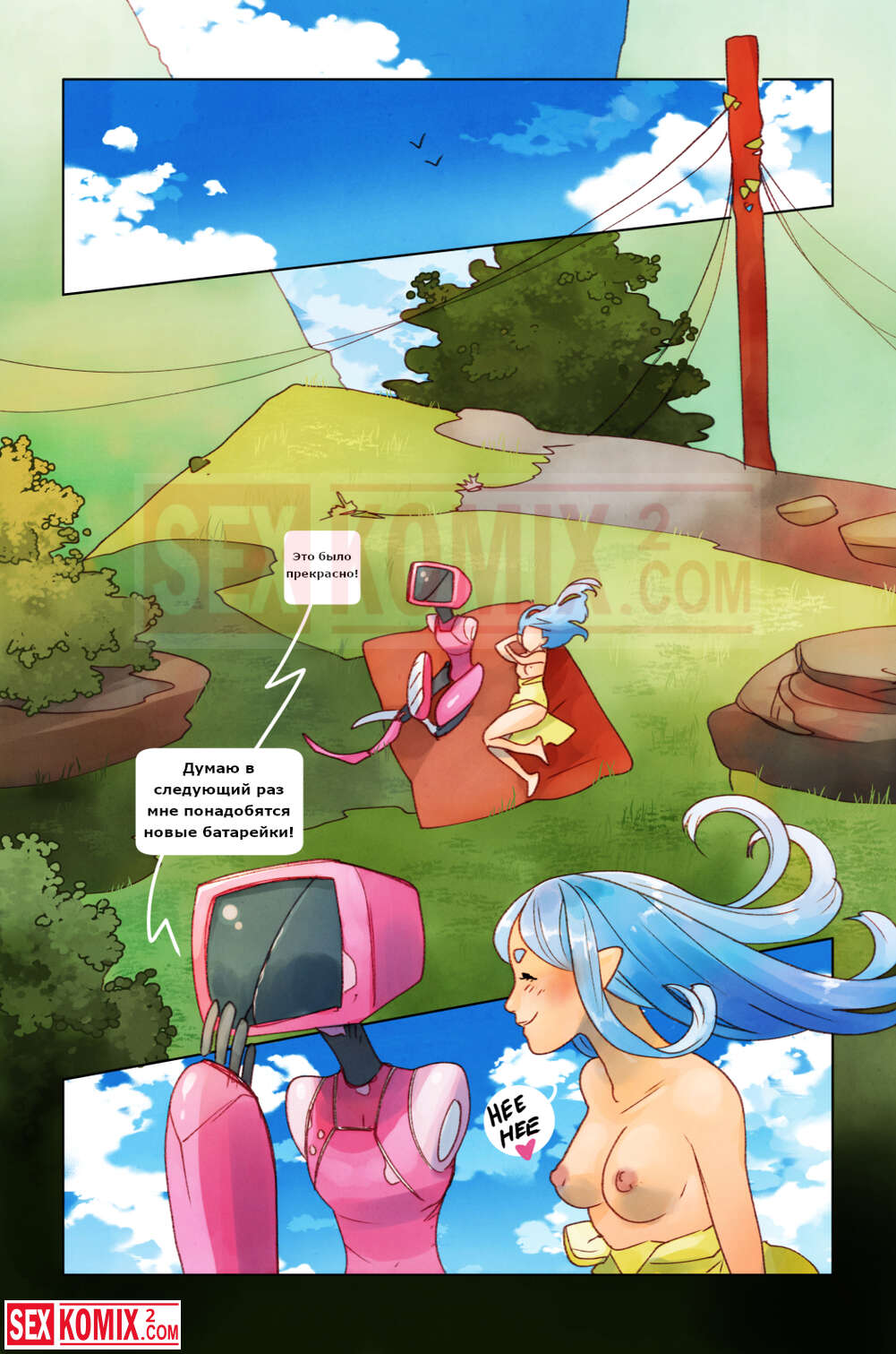Порно комикс Пикник. Девушка отправилась на пикник со своим роботом, рядом никого не было, и красотка воспользовалась им как секс игрушкой.