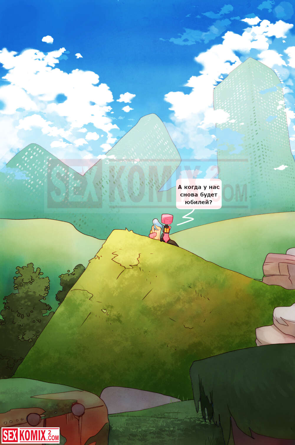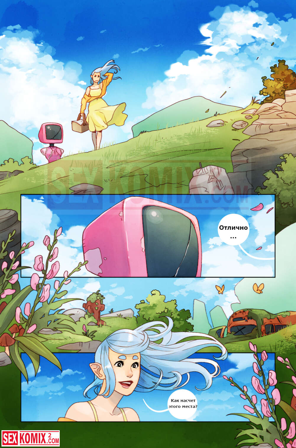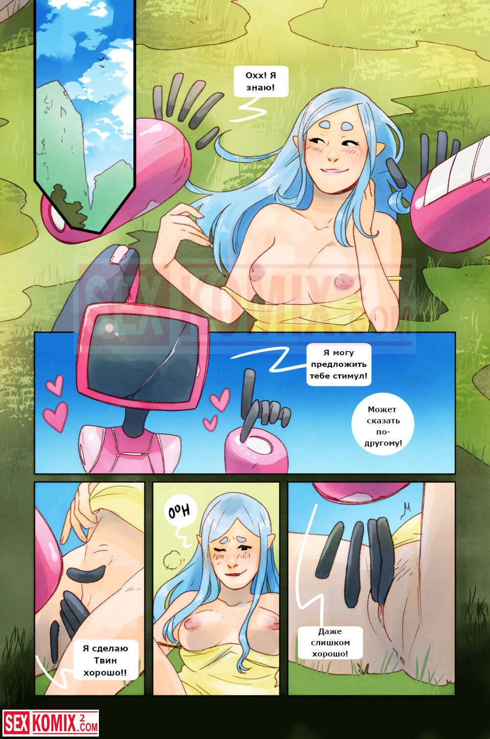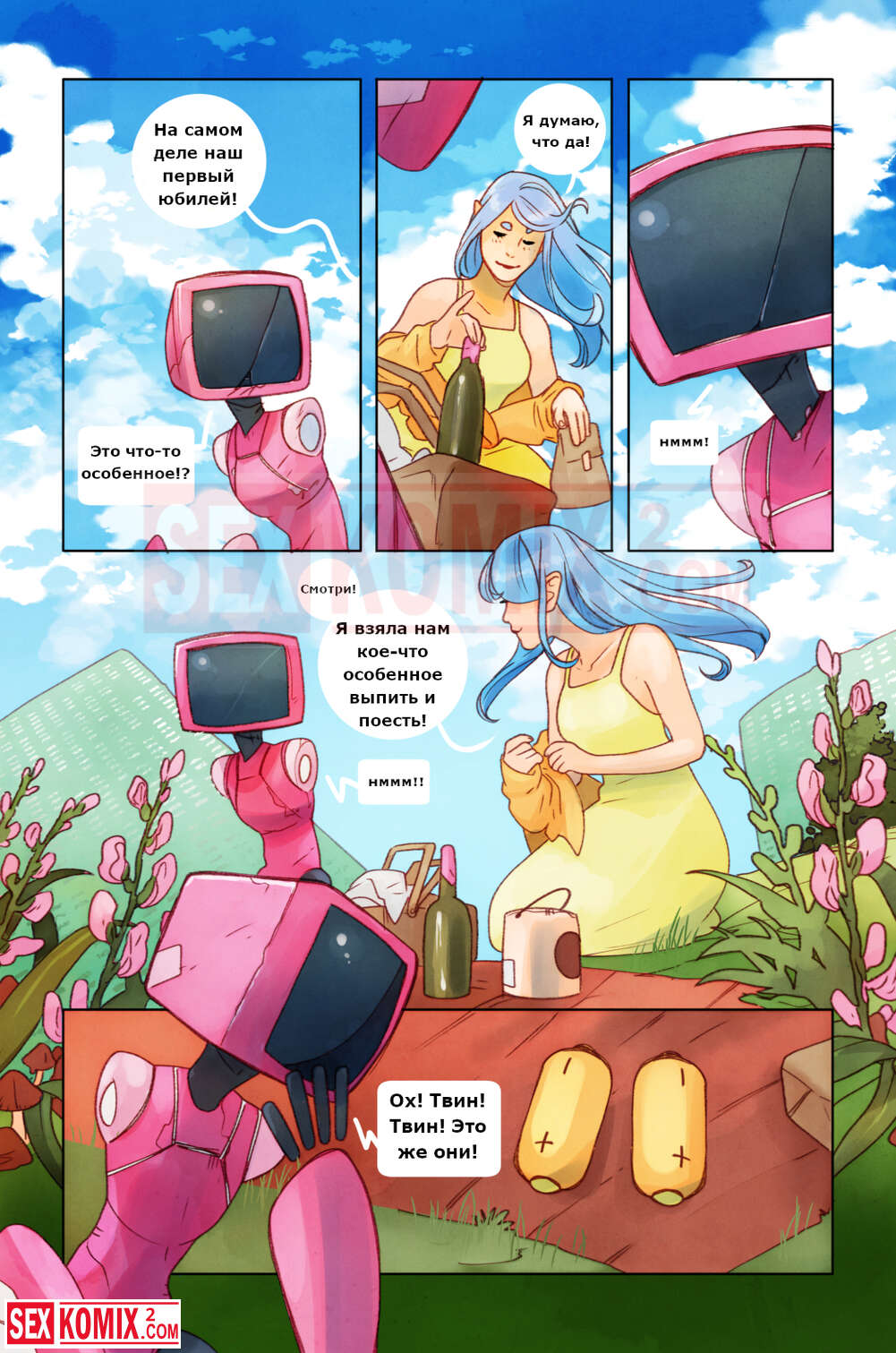 Порно комикс Пикник. Девушка отправилась на пикник со своим роботом, рядом никого не было, и красотка воспользовалась им как секс игрушкой.