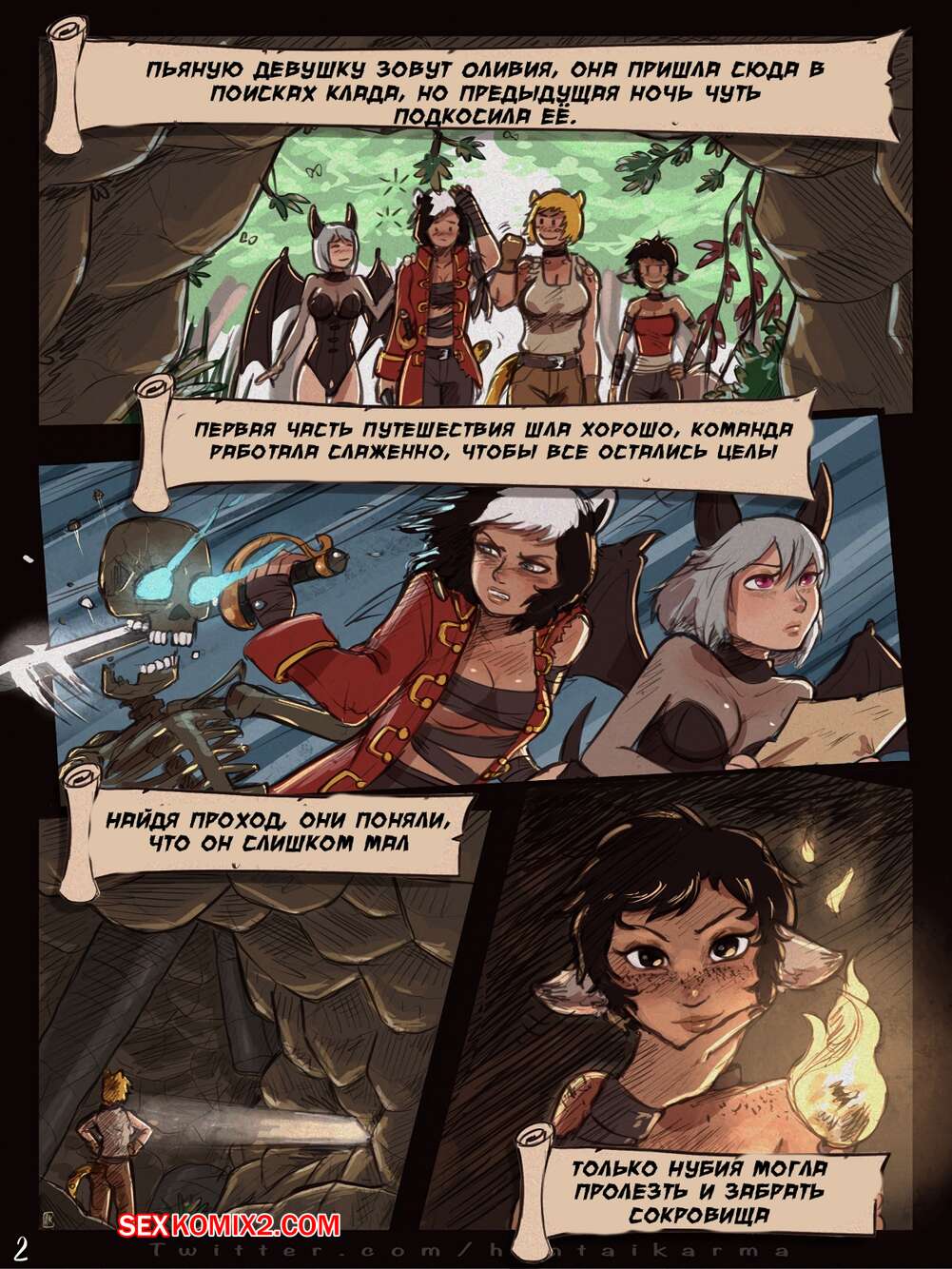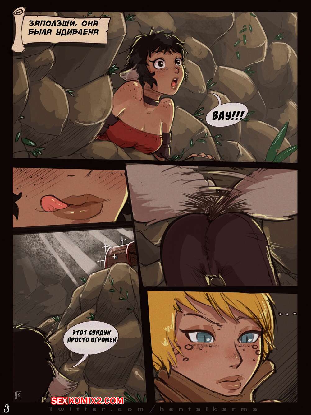 Порно комикс История мошенниц. Часть 1. Красотки на глубине. Crimson Karma Горячие сисястые красотки оказались в старой пещере и нашли необычное зелье, изза которого они очень возбудились. Красотки разделись и стали ласкать друг дружку, после чего занялись страстной еблей.