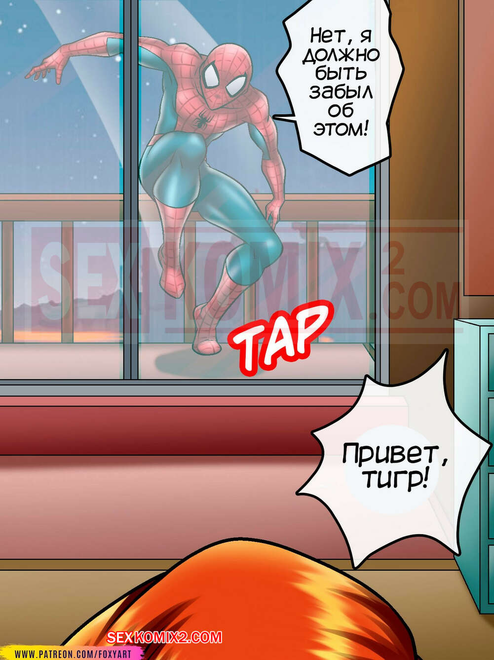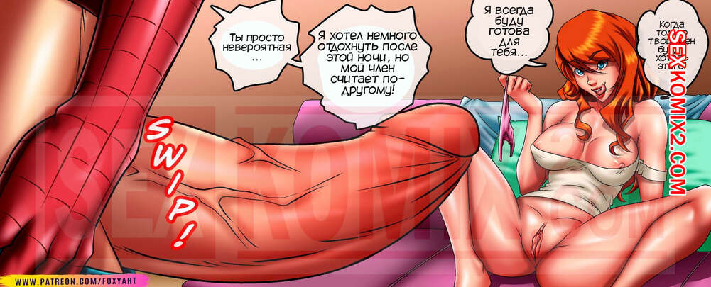Порно комикс Человек-паук. Мэри Веном. Spider Symbiosis. Foxyart. По возвращении паук ждал дома сюрприз в виде рыжеволосой красавицы, которая ждала его обнаженной в кроватке. Хуй паука сразу стал твердым как камень и пошел трахать пизду красотки.