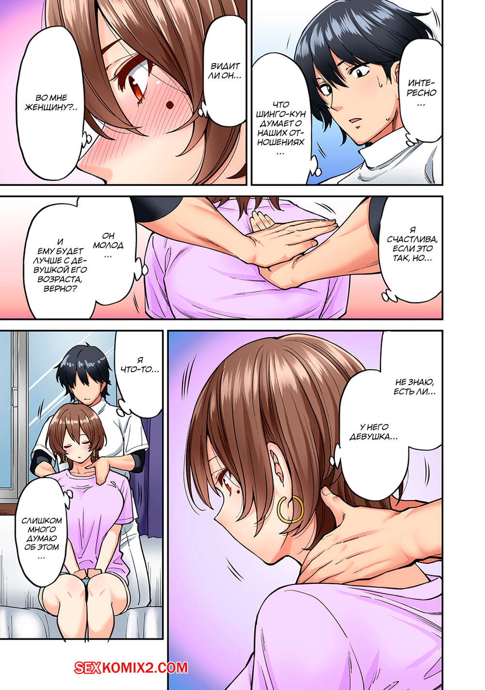 Порно комикс Массаж Hatsujou Munmun. Часть 6 Парнишка снова стал делать массаж своей зрелой красивой соседке, но ее огромные сиськи снова его возбудили. Тогда дамочка решила раздеться перед ним и их страсть и возбуждение снова переросли в хорошенькую еблю.