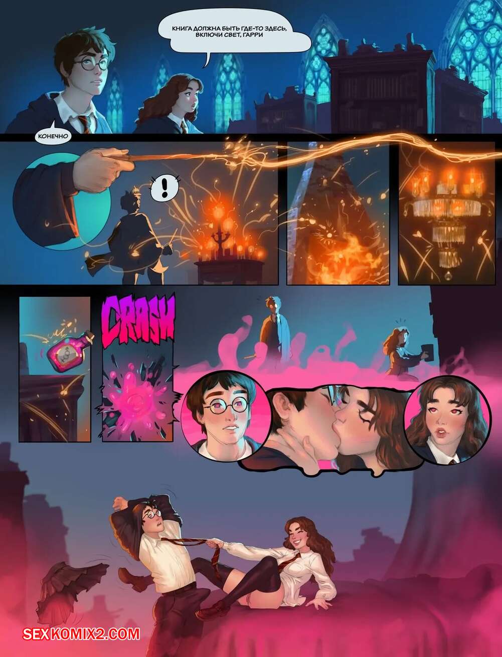 Порно комикс Гарри Поттер. Гарри и Гермиона в Выручай комнате. JOIXXX Гарри и Гермиона пришли в выручай комнату в поисках книги. Они случайно разбили любовное зелье и сильно возбудились. Парень разделся девушку и отлизал ее пизденку, после чего выебал подругу в задницу.