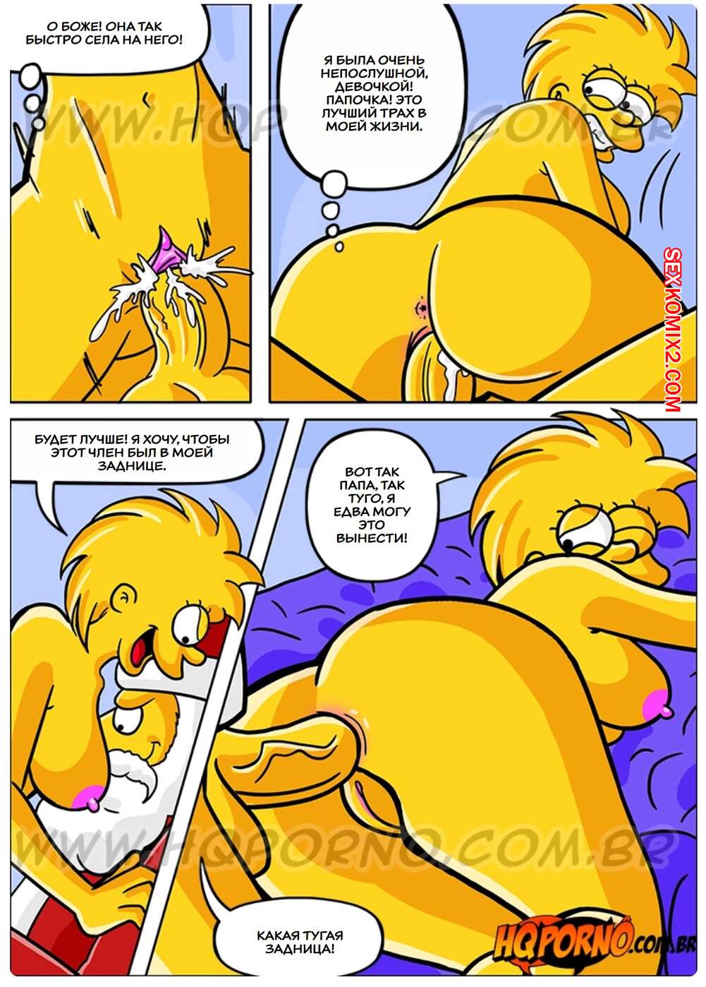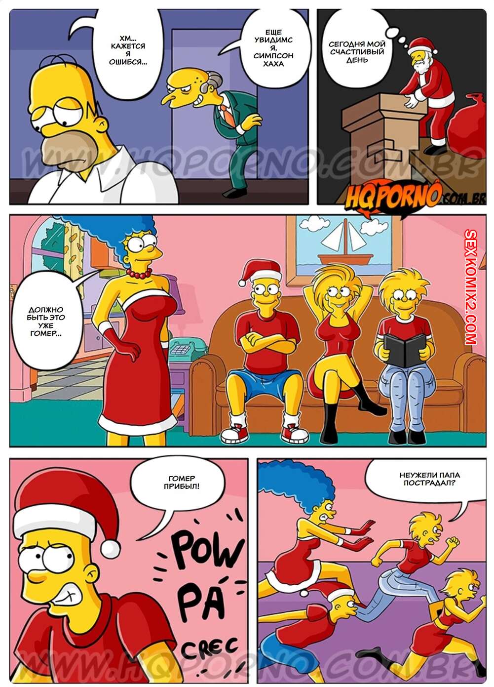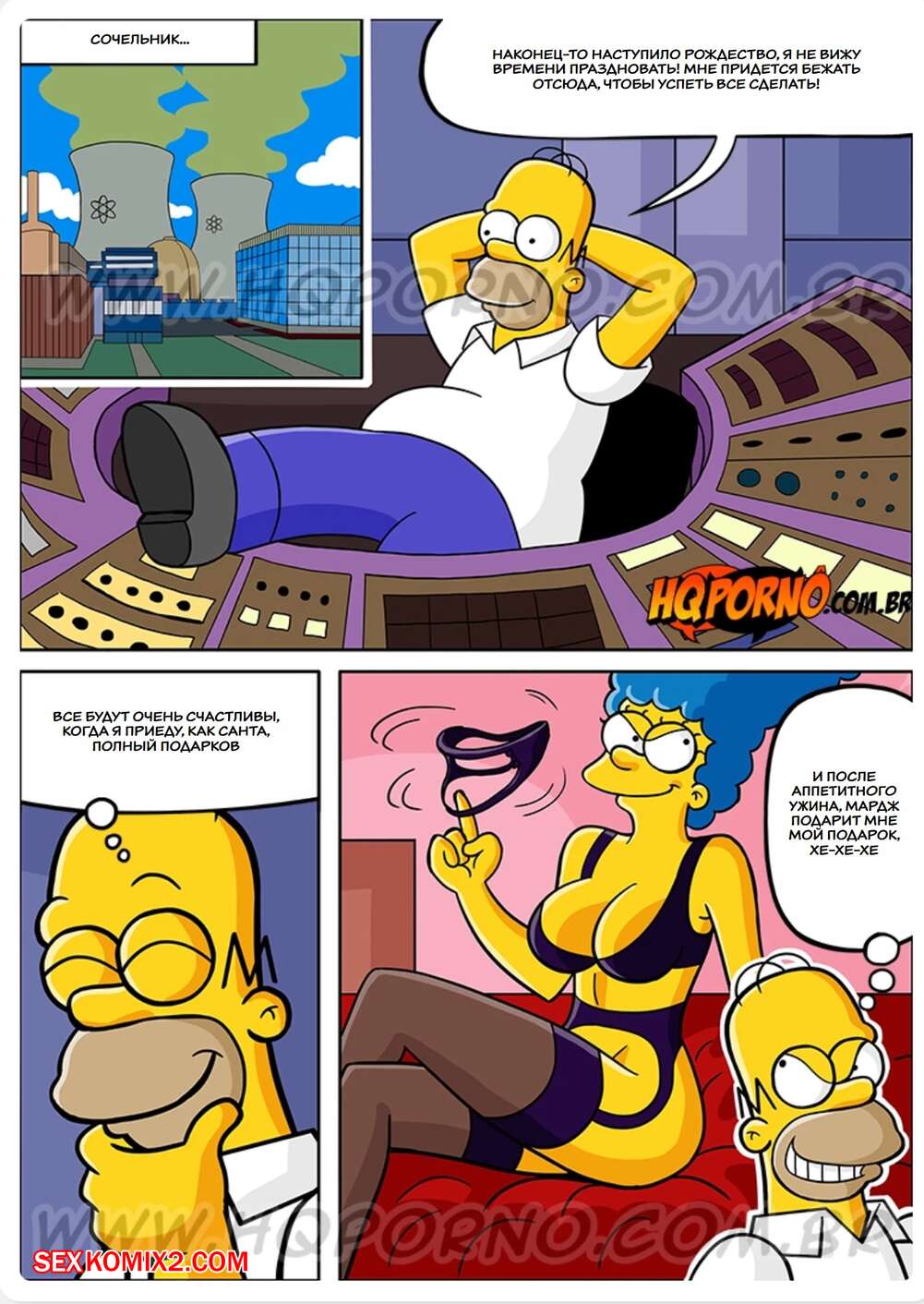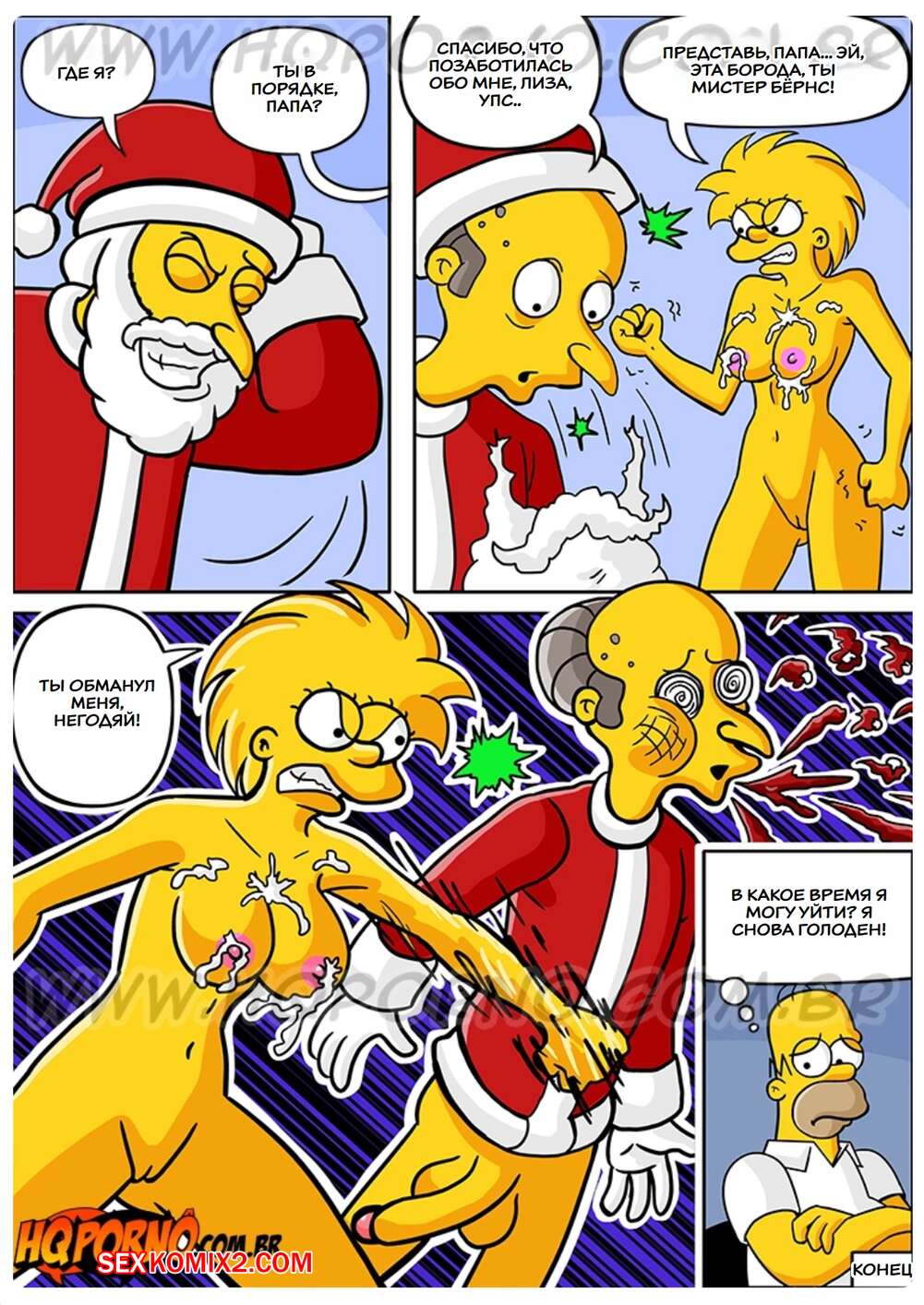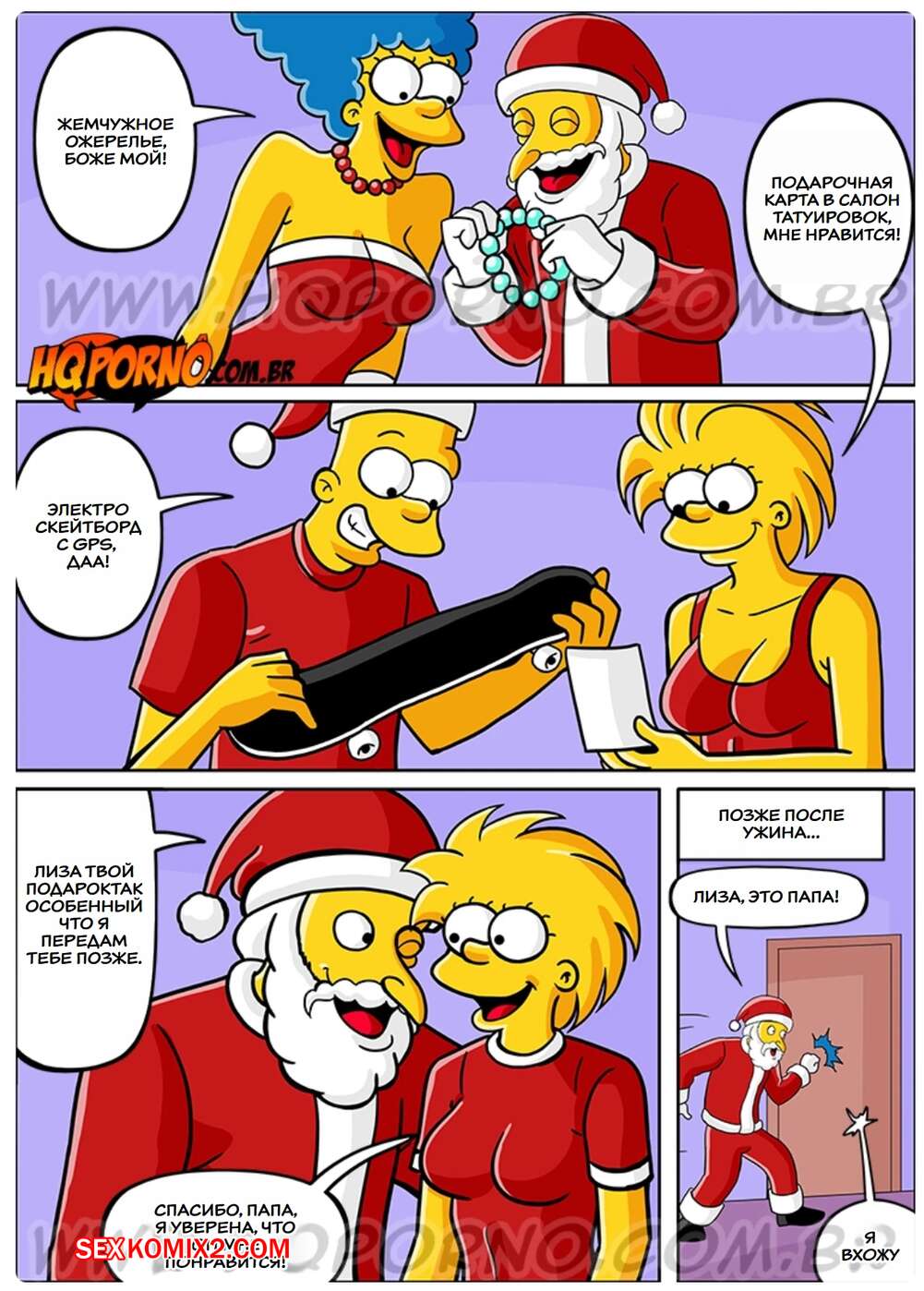 Порно комикс Симпсексы. Часть 17. Os Simpsexys. HQPorno Босс Гомера надел костюм Санты и отправился домой к его семье. Он сделал подарок дочери Гомера, а она позвала его в спальню, чтобы отблагодарить его и заняться сексом.