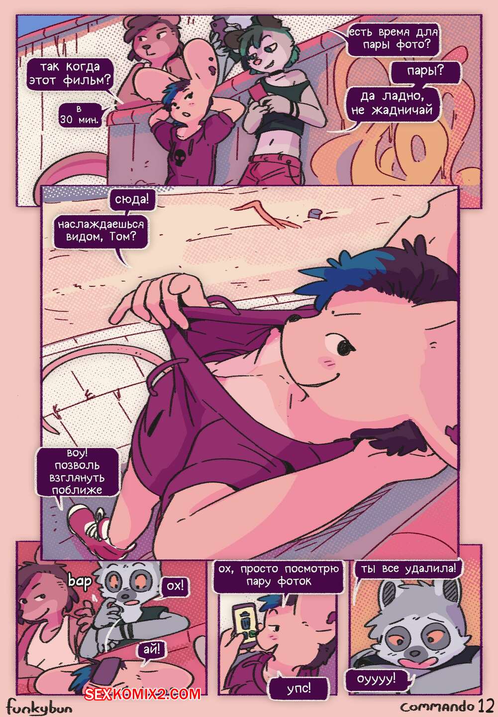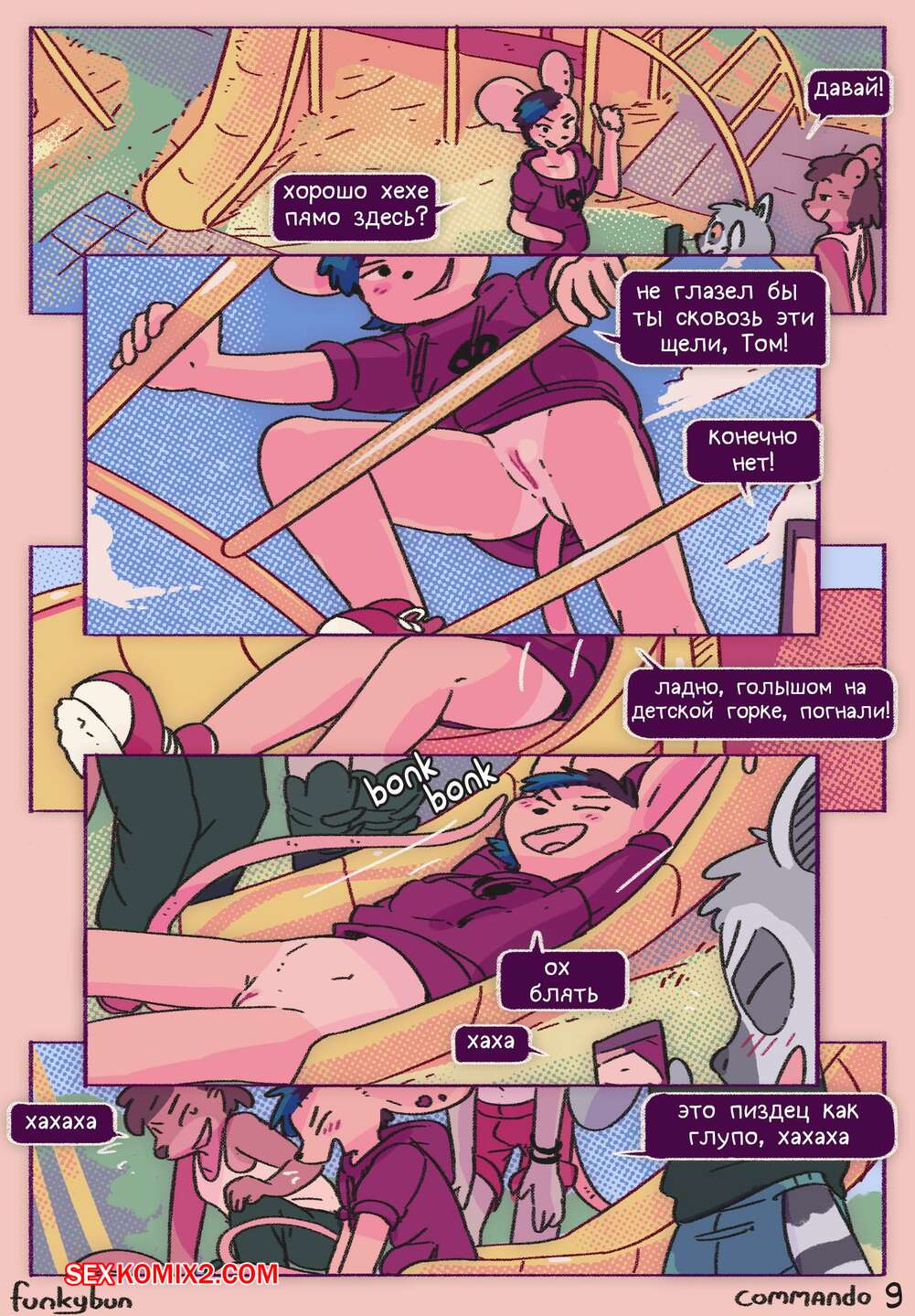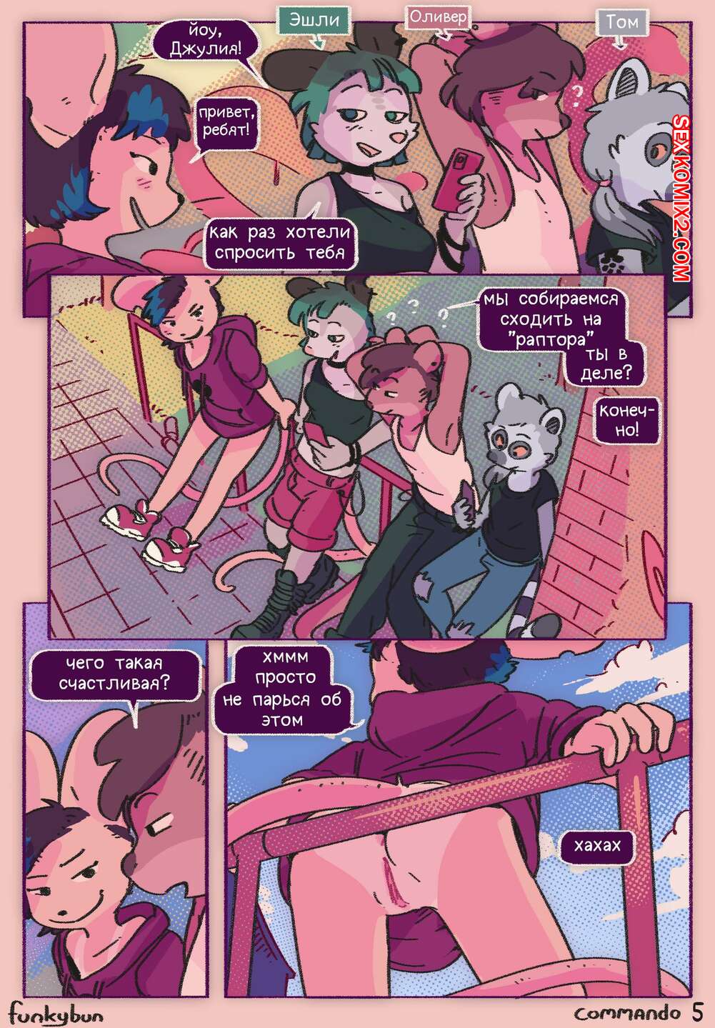 Порно комикс Commando. Funkybun Горячая красотка фурри отправилась на прогулку со своими друзьями и решила попробовать новый образ. Девушка надела только одну кофту на голое тело и отправилась в таком виде радовать парней.