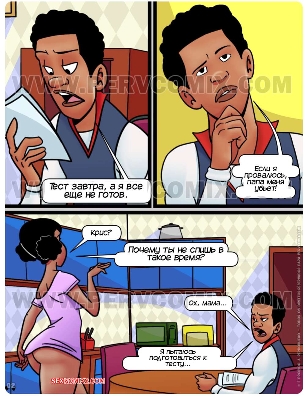 Порно комикс Крис всех заводит. Часть 3. Todo mundo excita o Chris. PervComix Крис занимался подготовкой к тесту, но никак не мог сконцентрироваться. Его горячая мамка решила добавить стимула парня, поэтому она разделась и отсосала хуец парня.
