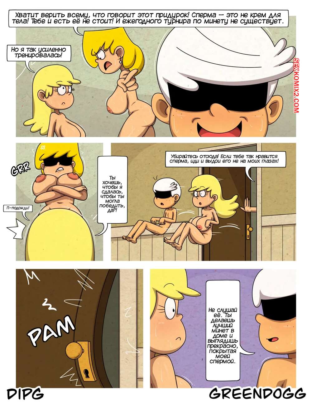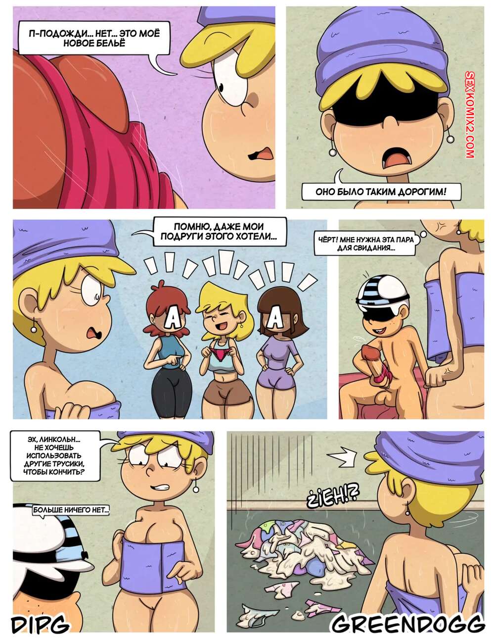 Порно комикс Шумный дом. Сексуальный инстинкты. Часть 2. Sexual Instincts. Greendog Блондинка намылась в душе перед походом на вечеринку, но когда она пришла в свою комнату, обнаружила что все ее трусики залиты спермой ее брата извращенца. Теперь у нее ни одних чистых трусиков.